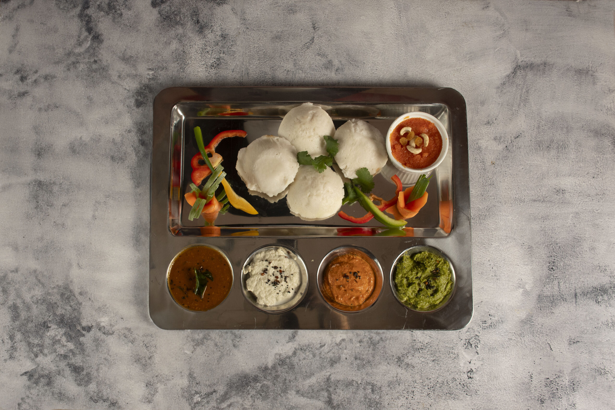 4 idli with Sambar and 3 chutneys