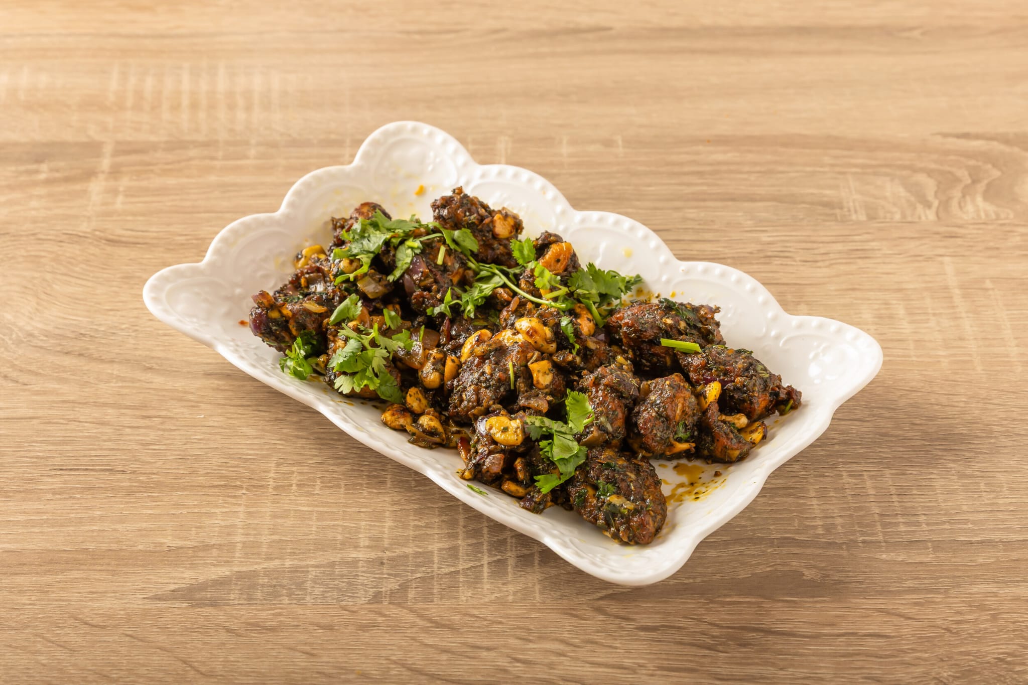Boneless chicken pieces sautéed with special blend of in-house spices, cashewnuts and fresh curry leaves.